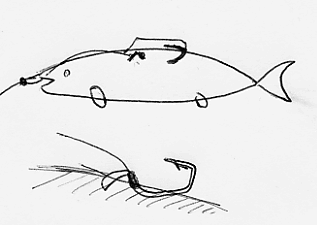 | いか餌釣は、生きた鯵やキスに2本背負わす様に付けて誘導し、藻イカやヒラメなどを狙う、プロ用針です。 付け方は、餌の魚の鼻の穴に通して、その後、背中に通し、固定する。(図参照)。 針の結ぶ位置。(図参照)。 |