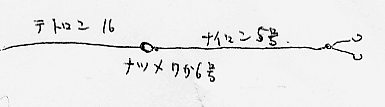 | 上糸は、テトロン16番、間に錘、ナツメ7号か6号の錘、下糸は、ナイロン5号で、7ヒロ(10.5メーター)。 餌魚の前で、二股に分ける。(図参照) |